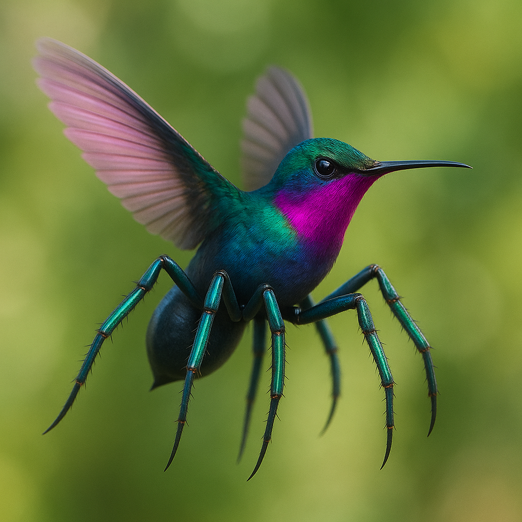 Hummingspider – Wings buzzing sweet like a fairy, eight legs dangling like nightmare tinsel. It doesn’t hum, it hunts, and it’ll thread you up midair before you even blink.